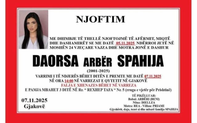 Këtë e kanë bërë të ditur familjaret e së ndjerës, derisa njoftuan se varrimi do të bëhet në varrezat e qytetit të Gjakovës me fillim nga ora 14:00.