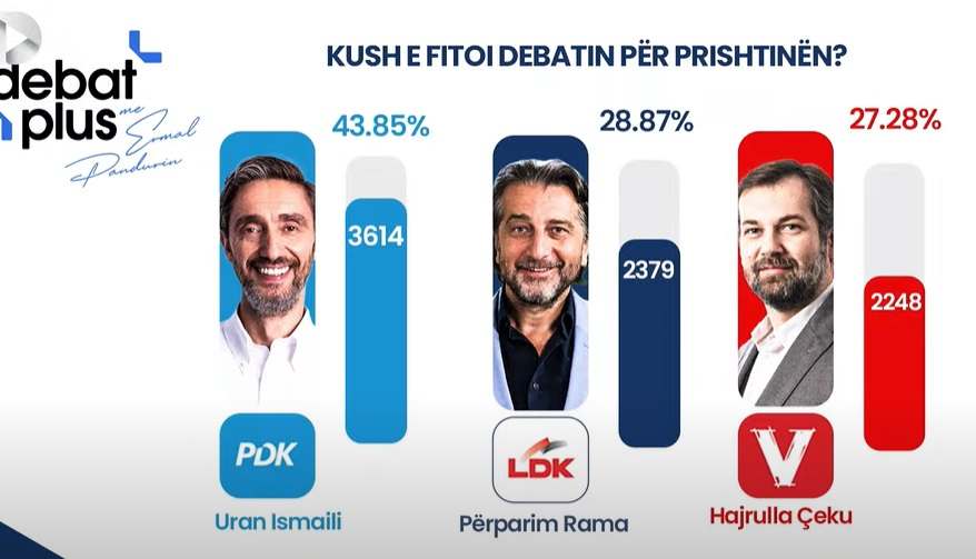Uran Ismaili fiton debatin në Debat Plus me 43.85%, Rama 28.87%, Çeku 27.28%