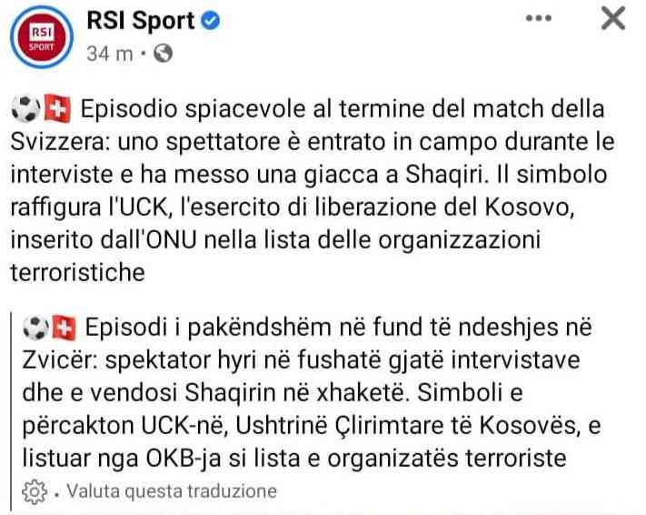 “Episodi i pakëndshëm në fund të ndeshjes në Zvicër: Tifozi hyn në fushatë gjatë intervistave dhe ia vendos Xherdan Shaqirit një xhaketë. Simboli në Xhaketë ishte i UÇK-së, Ushtrisë Çlirimtare të Kosovës, e listuar nga OKB si organizatë terroriste”, ky ishte përshkrimi i “RSI Sport”.