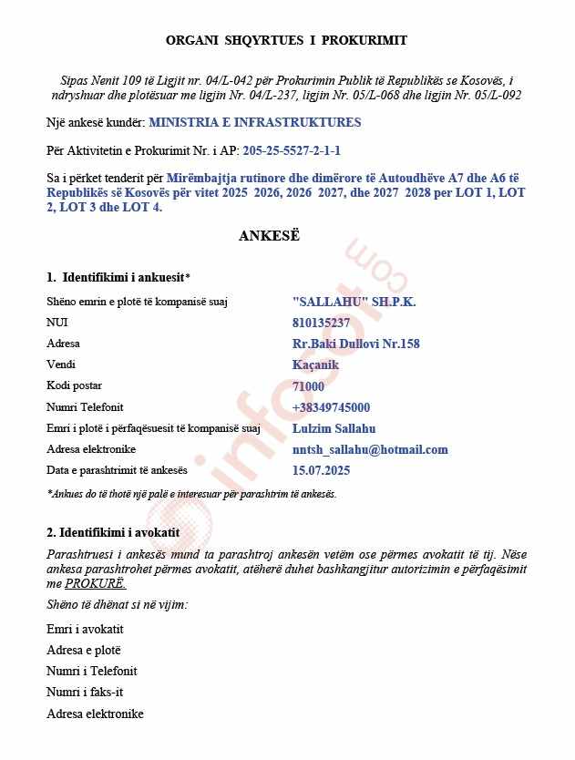Kompania “Sallahu” SH.P.K. nga Kaçaniku ka dorëzuar më 15 korrik 2025 një ankesë formale në Organin Shqyrtues të Prokurimit (OSHP), duke ngritur një sërë pretendimesh për shkelje të Ligjit për Prokurimin Publik, në lidhje me tenderin për “Mirëmbajtjen rutinore dhe dimërore të Autoudhëve A7 dhe A6 për periudhën 2025-2028”, me një vlerë të parashikuar prej 15,942,000.00 euro, shkruan Infosot.