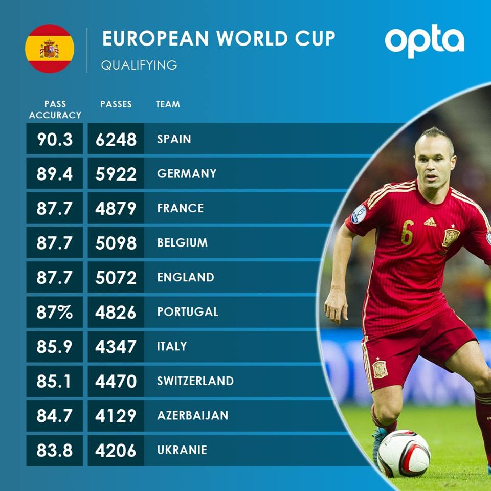 Kompania për statistika ‘Opta’, ka zbuluar edhe 10 Kombëtaret me më së shumti pasime në këto kualifikime.