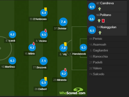 Nuk duhet harruar edhe mbrojtësi brazilian Joao Miranda, ndërsa më poshtë keni notat e lojtarëve nga të dy skuadrat: