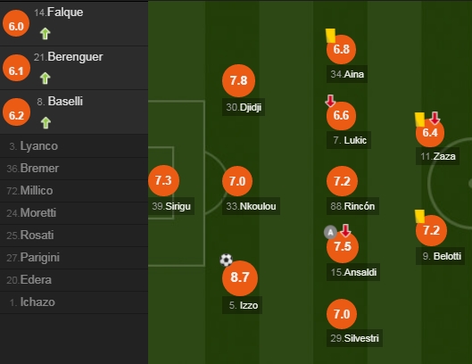 Izzo ishte lojtari i ndeshjes, por me notë të mirë te vendasit u vlerësuan edhe mbrojtësi Koffi Djidji, portieri Salvatore Siguru, por edhe dyshja në mesfushë Cristian Ansaldi-Tomas Rincon.