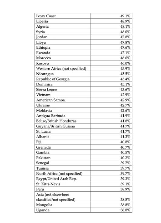Sipas këtyre të dhënave, 46% e familjeve nga Kosova që jetojnë në SHBA përfitojnë ndihmë sociale, duke e renditur Kosovën ndër vendet me përqindje të mesme të përfituesve. Ndërkohë, Shqipëria renditet me 41.3%, një shifër gjithashtu e konsiderueshme krahasuar me shumë vende të tjera, shkruan TopChannel.