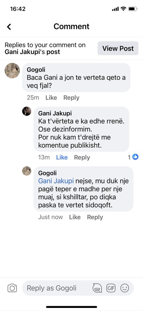 “Ka t’vërteta e ka edhe rrenë. Ose dezinformim. Por nuk kam t’drejtë me komentue publikisht”, ka shkruar Jakupi.