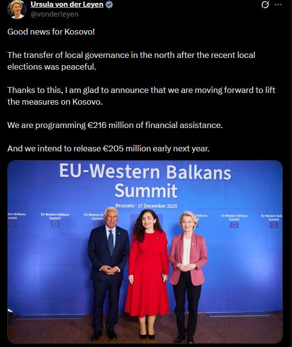 “Lajm i mirë për Kosovën! Transferimi i qeverisjes lokale në veri pas zgjedhjeve të fundit lokale ishte paqësor. Falë kësaj, jam i lumtur të njoftoj se po ecim përpara për të hequr masat ndaj Kosovës. Ne po programojmë 216 milionë euro ndihmë financiare. Dhe kemi ndërmend të lëvrojmë 205 milionë euro në fillim të vitit të ardhshëm”, ka shkruar ajo në “X”.
