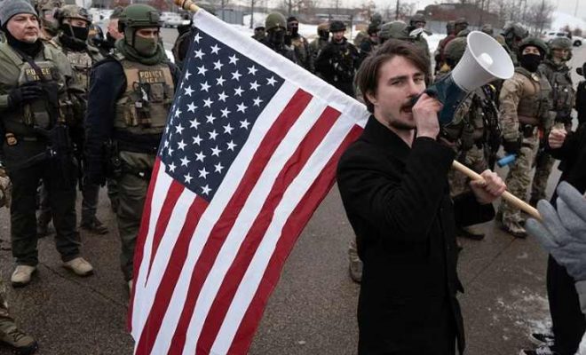 Më vonë, burri me flamurin amerikan u pa duke zhvilluar një diskutim me një protestues anti-ICE, i cili po përpiqej ta bindte atë të shihte me kujdes videon e të shtënave vdekjeprurëse.