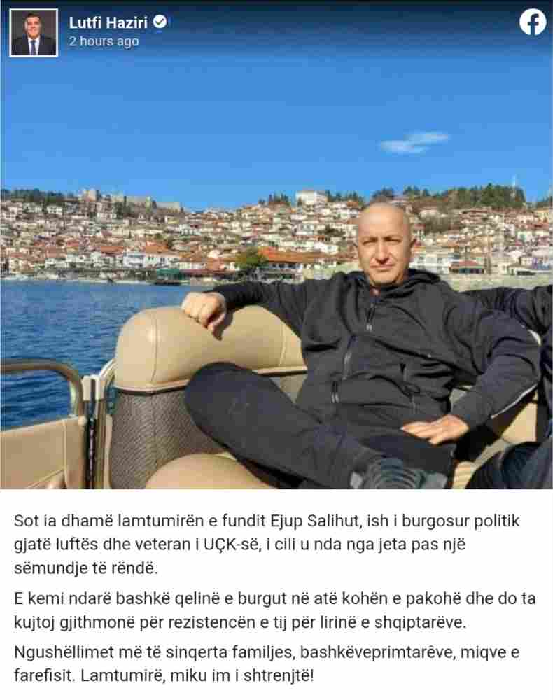 “Sot ia dhamë lamtumirën e fundit Ejup Salihut, ish i burgosur politik gjatë luftës dhe veteran i UÇK-së, i cili u nda nga jeta pas një sëmundje të rëndë. E kemi ndarë bashkë qelinë e burgut në atë kohën e pakohë dhe do ta kujtoj gjithmonë për rezistencën e tij për lirinë e shqiptarëve.