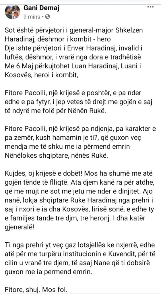 Deputetë, zyrtarë, kryetar degësh, ish/zyrtarë dhe këshilltarë të Ramush Haradinajt, sulmojnë me fjalë të rënda, kritikojnë ashpër dhe shkojnë aq largë sa mallkojnë atë dhe nënën e saj, pas një deklarate të deputetës së Kuvendit të Kosovës, nga rradhët e LVV’së, Fitore Pacollit, që kishte bërë për nënën e Kryetarit të Aleancës për Ardhmërinë e Kosovës, raporton Infosot.