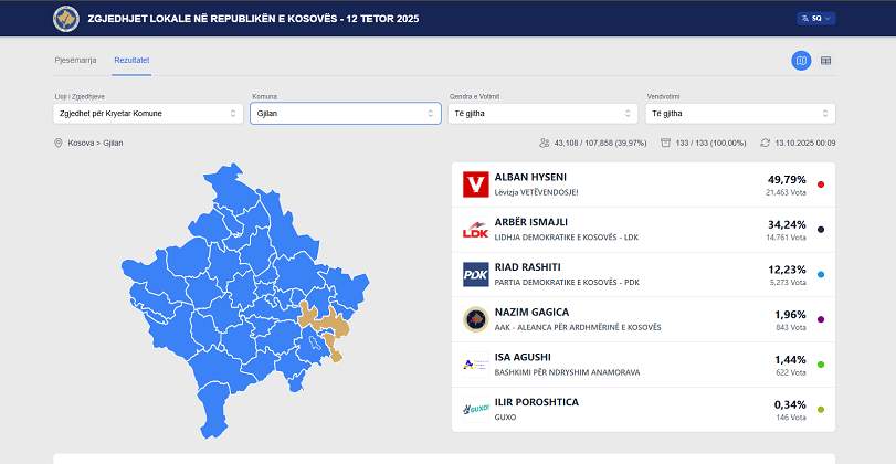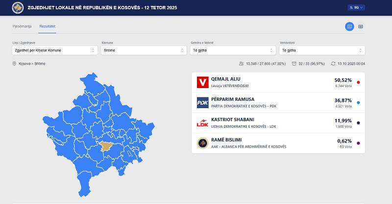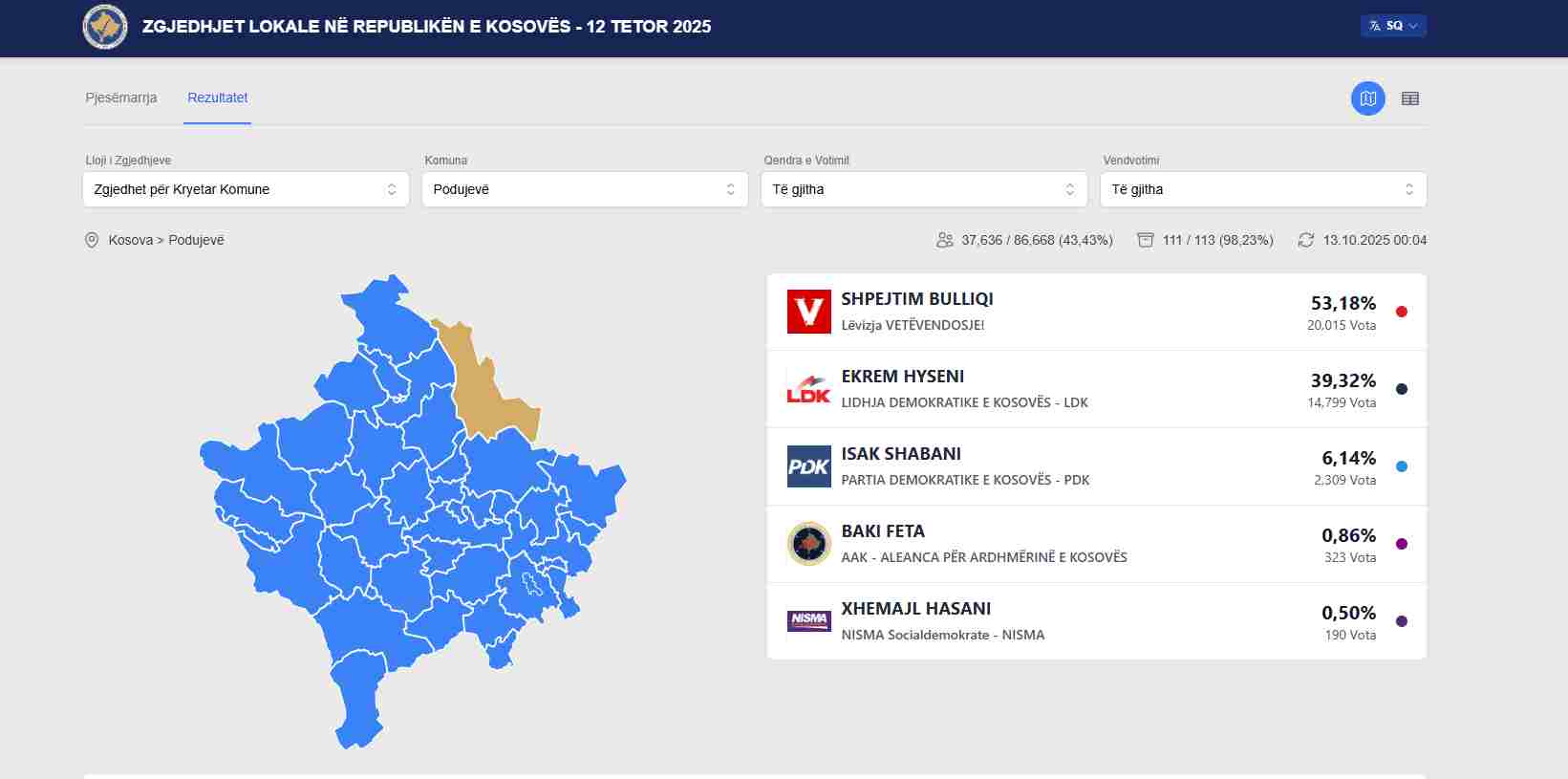Nga numrimi i 98. 23 për qind të votave Shpëtim Bulliqi ka marrë 20 mijë e 15 vota ose 53.18 për qind.