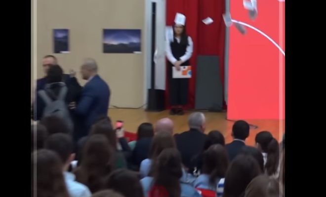 Kryeministri Albin Kurti përgjatë fjalimit të tij në panairin e rinisë është fishkëllyer dhe gjuajtur me disa letra, nga aktivisjta e PSD’së, Sonila Pllashniku.