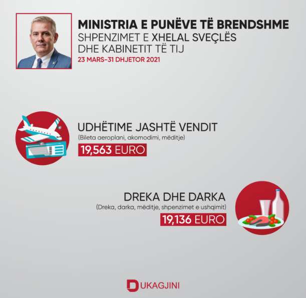 Në total Ministri Xhelal Sveçla dhe kabineti i tij kanë shpenzuar gjithsej 38 mijë e 699 euro në një periudhë kohore prej 9 muajsh.