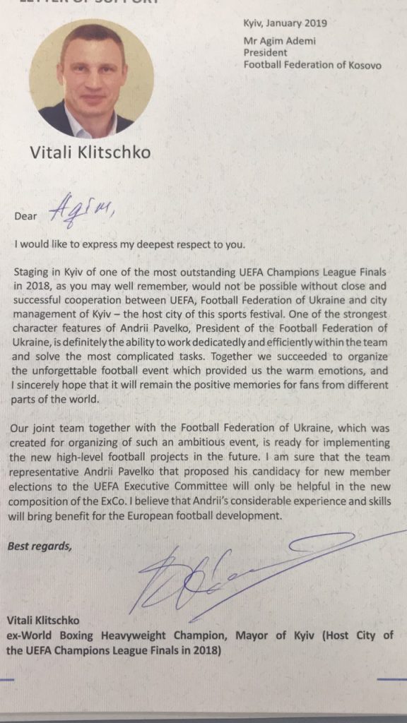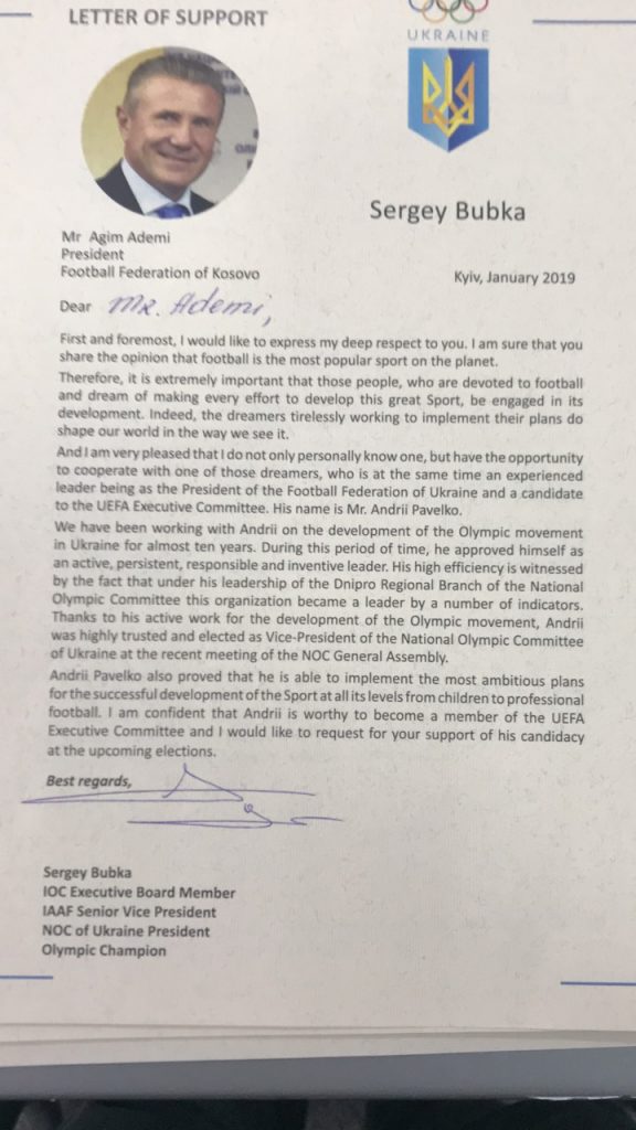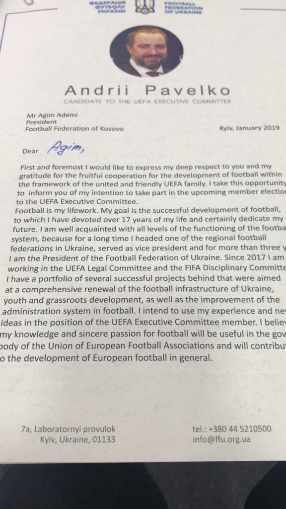 Figurat e shquara të sportit ukrainas e kanë uruar Ademin për sukseset e Kosovës duke i ofruar bashkëpunim të ndërsjellë, ndërsa i kanë kërkuar përkrahjen për kandidatin e tyre, Andriy Pavelko për zgjedhjet për anëtar të KE të UEFA-s. /Telegrafi/