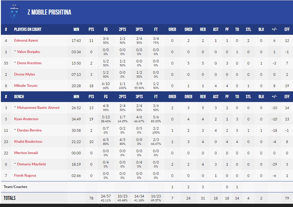 Te Prishtina u dalluan Kyan Anderson (19 pikë), Simone Tmusic (18) dhe Muhammed Bashir Ahmed (13).
