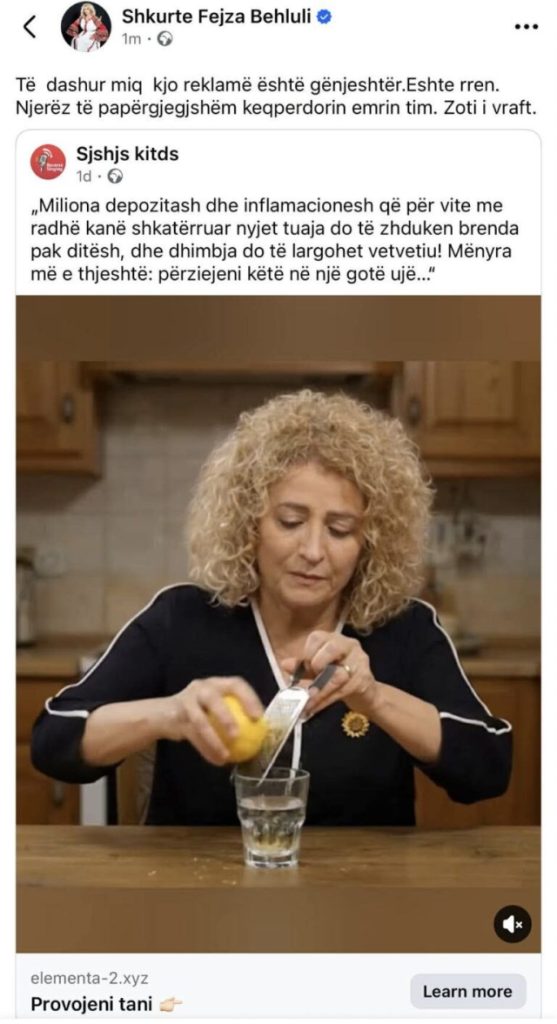 “Të dashur miq kjo reklamë është gënjeshtër.Eshte rren. Njerëz të papërgjegjshëm keqperdorin emrin tim dhe nuk hera e parë. Zoti i vraft.” – ka shkruar ajo.