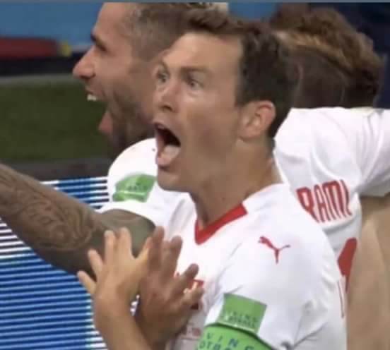 Stephan Lichtsteiner duke bërë me duar Shqiponjën pas golit të Shaqirit