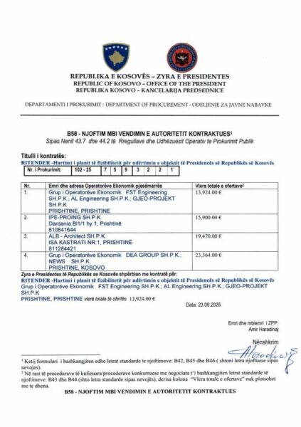 Ky është hapi i parë zyrtar që shënon nisjen formale të procesit, duke i hapur rrugën hartimit të planit të fizibilitetit dhe më pas nismës së projekteve për ndërtimin e objektit të ri të Presidencës së Republikës së Kosovës.