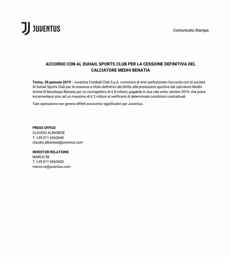 Juventusi përmes një deklarata për media njofton se lojtari është shtiru te Al-Duhail për 8 milionë euro që do të paguhen me dy këste, ndërsa dy milionë tjera vijnë në formë bonusesh.
