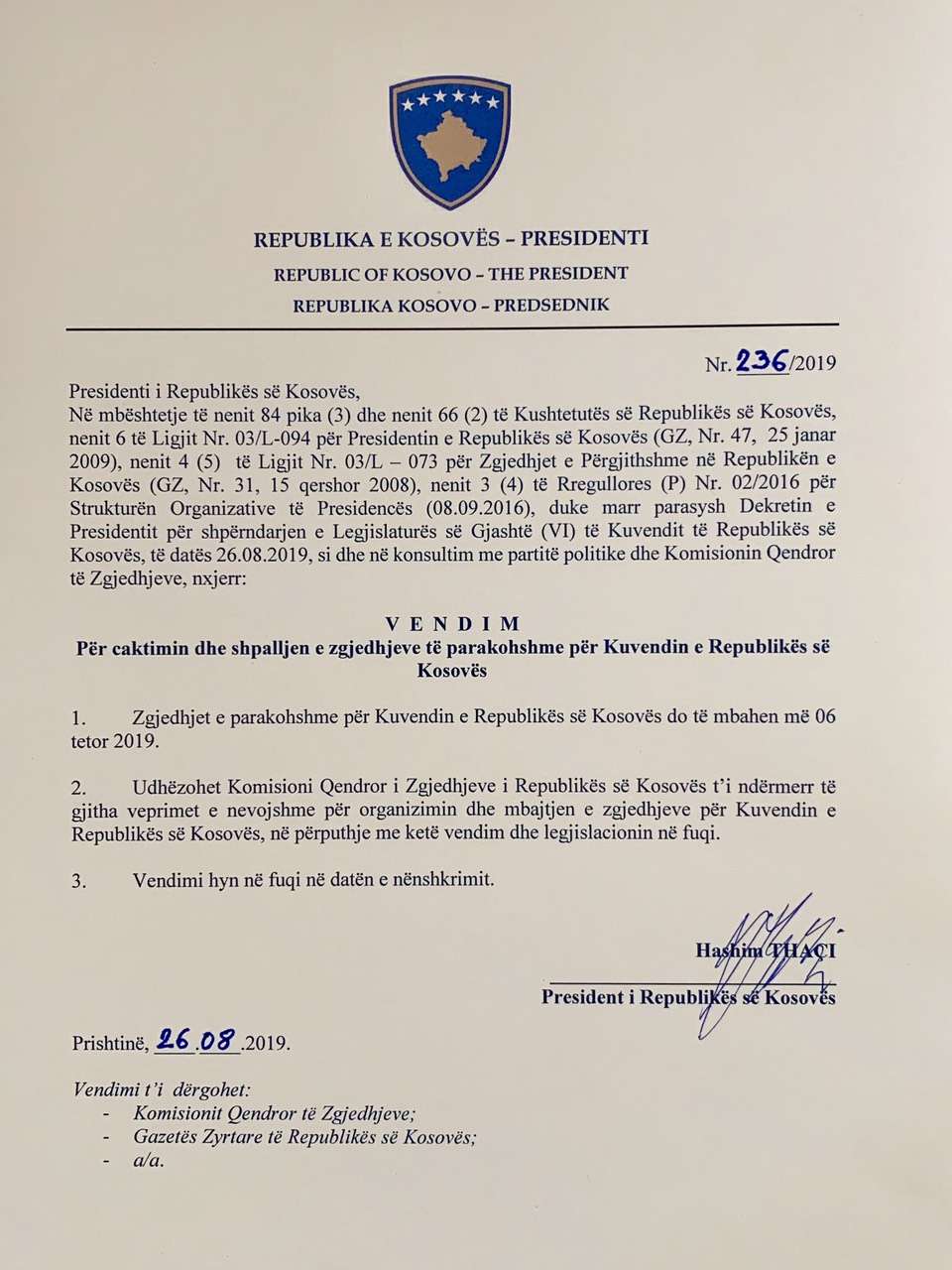 Në vendimin e nënshkruar thuhet se “duke u bazuar nё pёrgjegjёsitё kushtetuese dhe ligjore, presidenti Thaçi ka marrё vendim që zgjedhjet e parakohshme për Kuvendin e Republikës sё Kosovës tё mbahen mё 06 tetor 2019”.